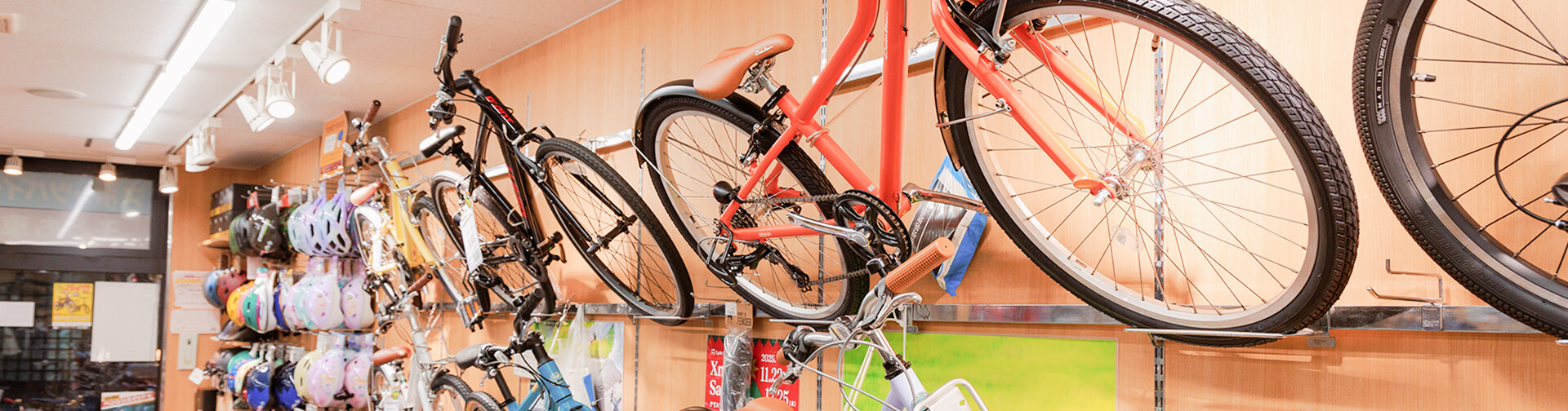 一般車・子供車・電動アシスト自転車・エントリーモデルのスポーツバイク、アクセサリーやパーツを幅広く揃えています。